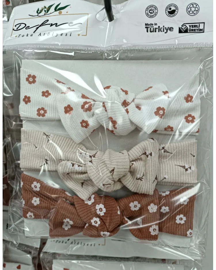 ÜÇLÜ LİKRALI 0-2 YAŞ PENYE BANDANA SET / KAHVERENGİ ÇİÇEKLİ