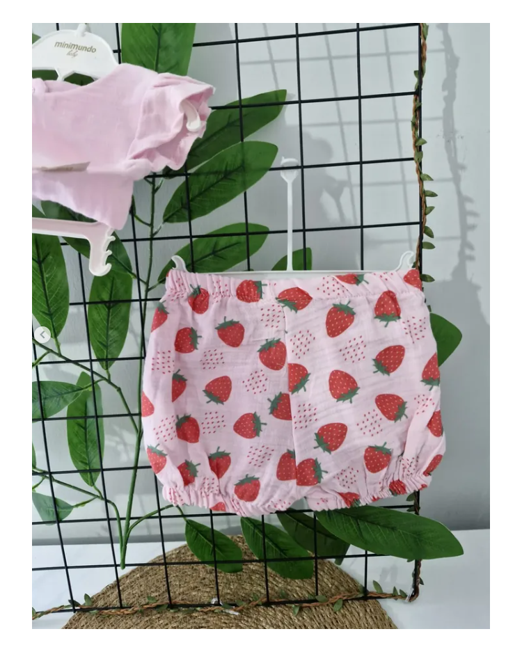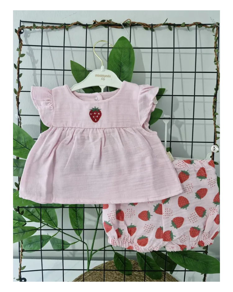 MİNİMUNDO FULL MÜSLİN ÇİLEKLİ ŞORTLU KIZ TAKIM / PEMBE