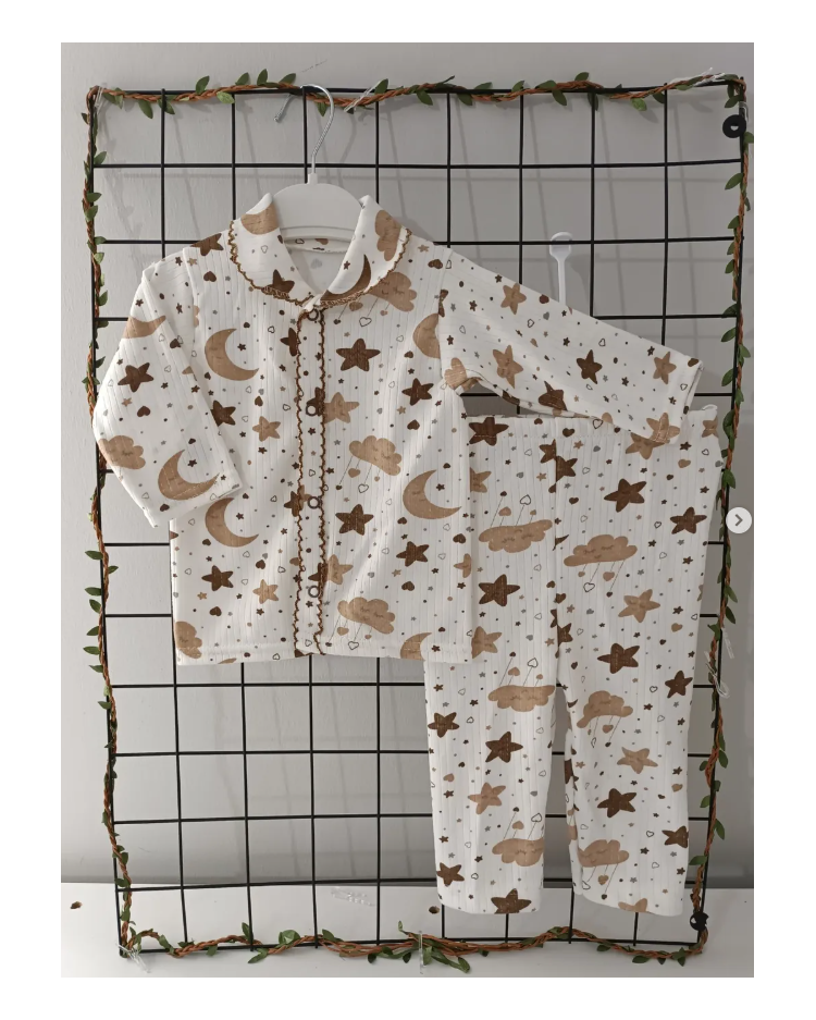 3-6 AY TAMAMEN PAMUKLU KUMAŞ ÖNDEN ÇITÇITLI PİJAMA TAKIMI ÇEŞİTLERİ / BEYAZ ZEMİN KAHVE YILDIZLI