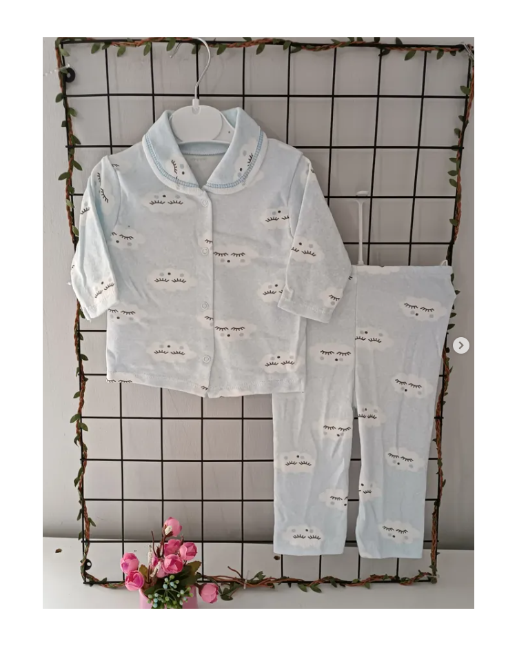 3-6 AY TAMAMEN PAMUKLU KUMAŞ ÖNDEN ÇITÇITLI PİJAMA TAKIMI ÇEŞİTLERİ/ MAVİ ZEMİN BULUTLU